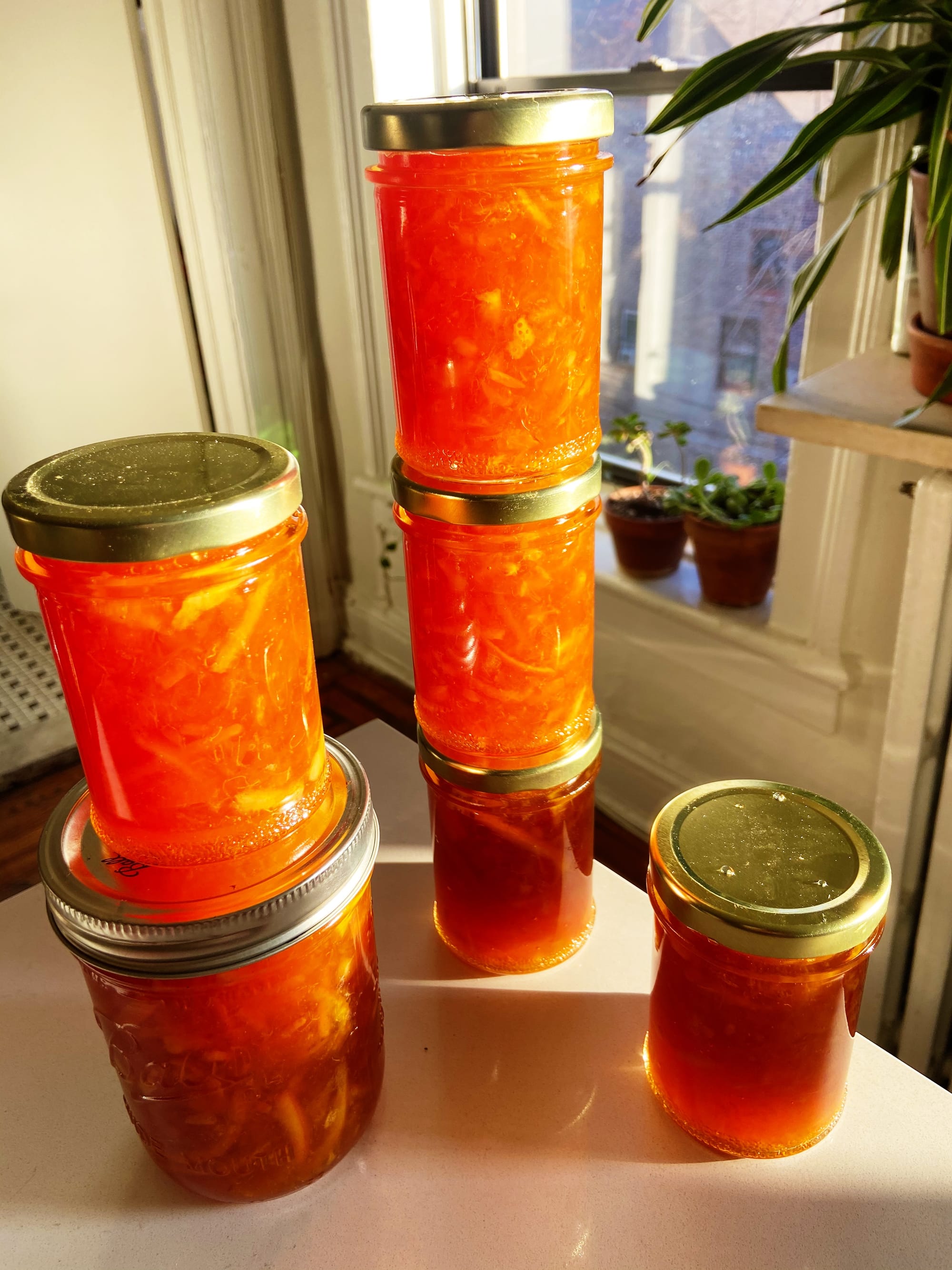 Anyway, marmalade. Marmalade takes for-fucking-ever to make. There’s the slicing of the fruit for which there are no shortcuts, then an optional but recommended 24 hour soaking period before you even start cooking. The fruit gets boiled for at least two hours before sugar gets added, at which point it cooks for another 60-90 minutes, at least. Then the intense babysitting of the pot as the marmalade gets close, careful not to let the sugars scortch or caramelize. Once it’s ready you’re dealing with the painstakingly careful distribution of hot marmalade into sterile jars and then, the whole canning process (if you’re canning). After that, you’re spending more time than you’d like cleaning up the sticky bits of fruit and sugar that ended up all over the place: your clothes, your forearms, the walls of your kitchen. It’s a full day and a half of your life.