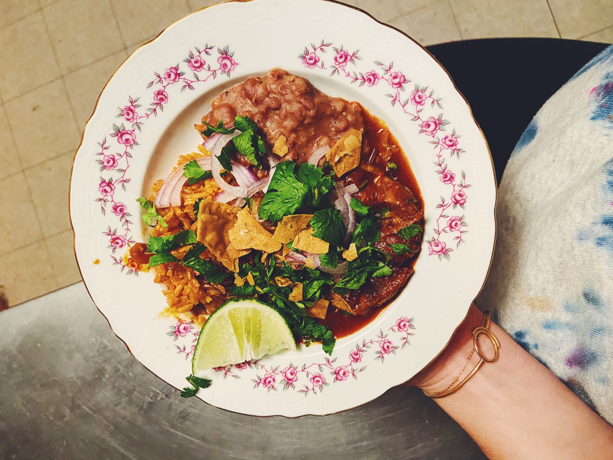 The earliest I ever saw Amiel wake up was the day he decided to make Rick Martinez’s Chili Colorado. He spent all day lovingly tending to his pot, browning meat, toasting chiles, blending spices, reducing beer, etc. To turn things into an even more involved affair, he took one of my pots of brothy beans and turned them into the refried variety, which took even more attention and care. At long last, he served the chili and the refried beans in one beautiful bowl with crumbled up tortilla chips, pickled red onions, and lots of cilantro. There were also limes for squeezing over. The nice thing about making this is that it truly takes all-day, which means you’re smelling Chili Colorado all day, which means by the time you sit down to a bowl, it quickly becomes the best thing you’ve ever eaten. And honestly, it was!