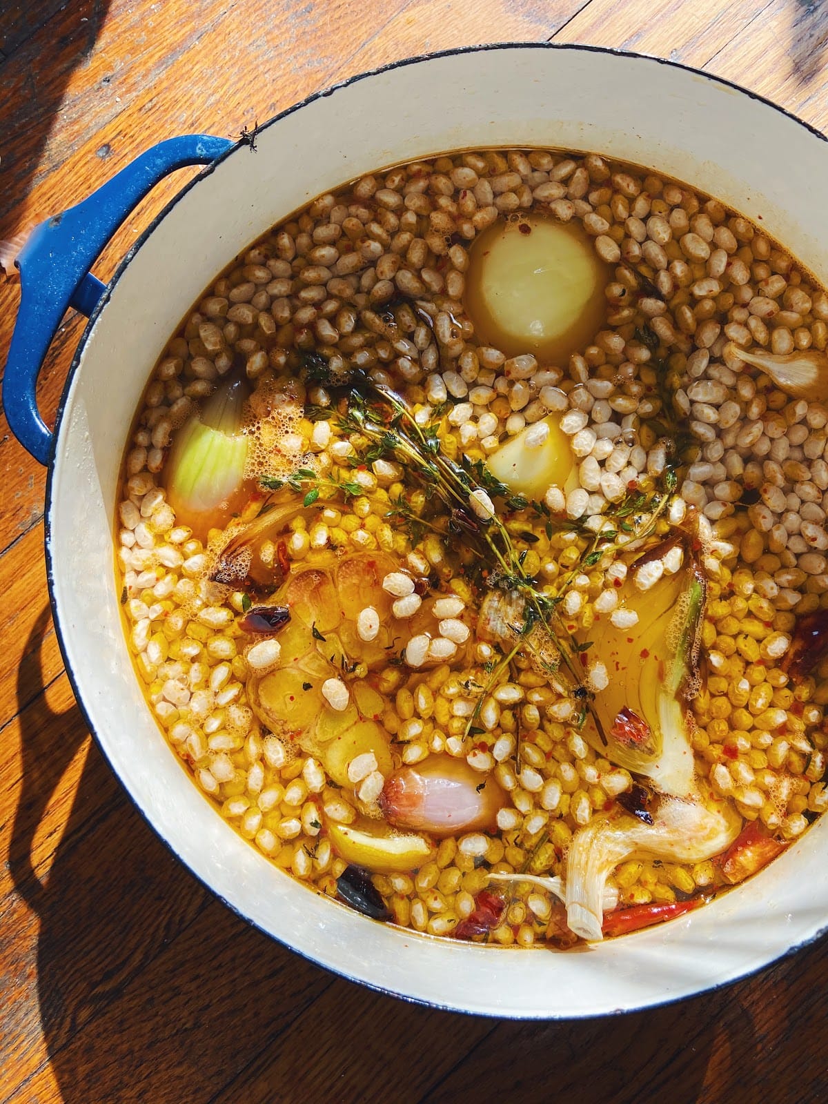 [I feel like who among us needs one more recipe for a basic pot of beans? If you do, know that everyone very much has their own methods, tips, tricks, etc. they swear by and even for me, that can change depending on the day and the weather. But the basic gist is: Put a pound of dried beans (I am blessed with being a card carrying member of the Rancho Gordo Bean Club so really just cook whatever they send me, but generally speaking I especially love large lima beans and these smaller Yellow Eye Beans) in a large pot, cover by about 3” of water (no, I don’t soak them before cooking—I do not understand how soaking something for 24 hours saves time lol—but yes, you can if you want!), add 1 quartered red or yellow onion and a halved head of garlic (I peel neither), a few sprigs of woody herbs like thyme, rosemary, marjoram, oregano, dried chiles if you have, and a half a lemon if you like (or maybe just the peel). Season with a good amount of kosher salt and add a healthy pour of olive oil on top and bring to a strong simmer. Turn the heat down to a bare simmer, leave the pot uncovered and cook until, as Steve Gordo puts it, “they’re done.” This can take anywhere from 50 to 120 minutes depending on the size and age of the bean. If the beans need more liquid as they simmer, add more water. Depending on the bean and your preference for their final destination, the beans can be creamy and fall apart-y or tender and semi al-dente. I am not a bean expert, just a bean enthusiast, but just know I feel like the only way to truly ruin a pot of beans is if you buy old beans (they’ll never become tender). If you want to know more about BEANS, this book from Rancho Gordo and this book by one of the original vegetarian queens, Crescent Dragonwagon, are great references.]