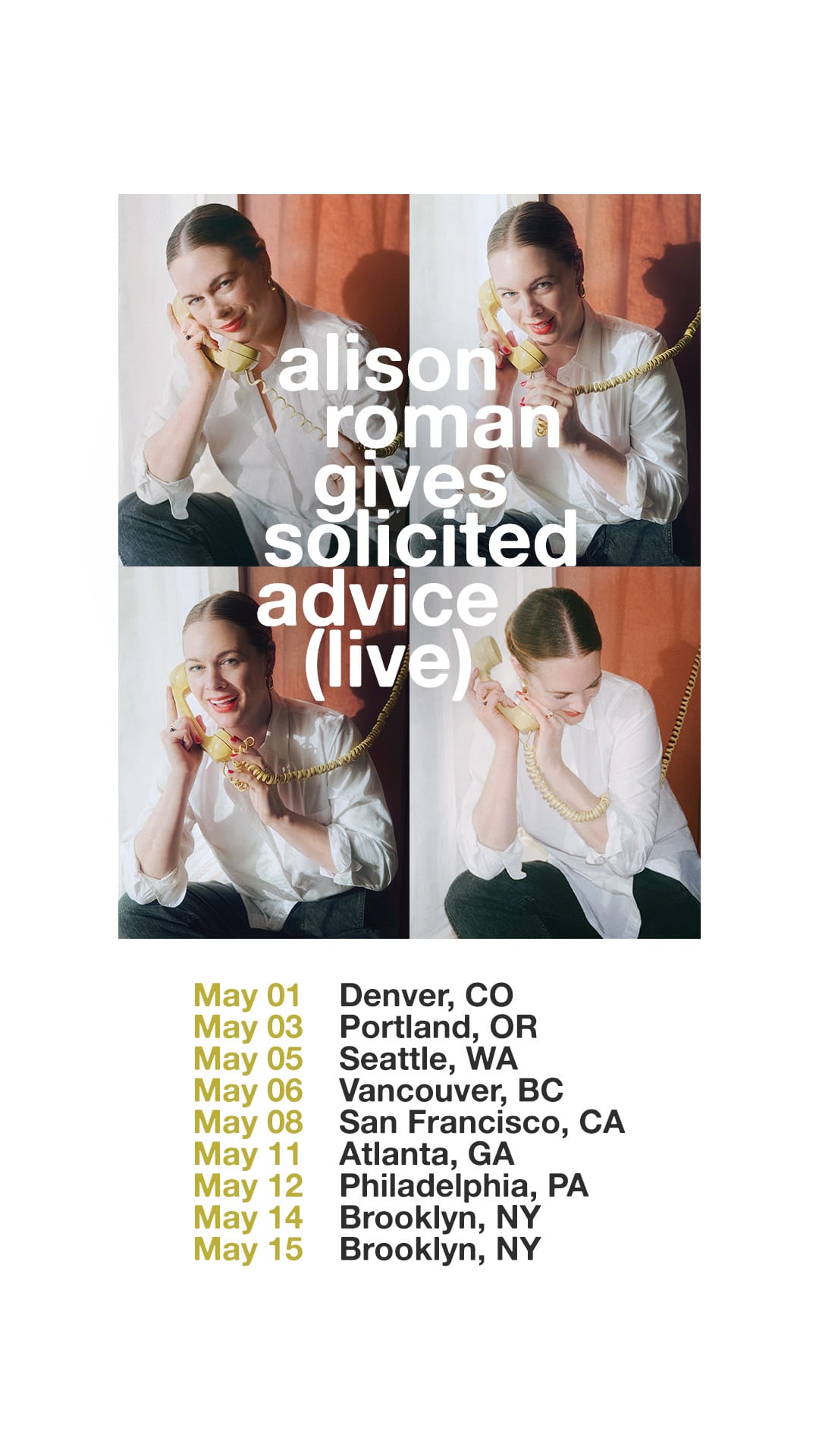 *note: Brooklyn night one SOLD OUT, Denver, San Francisco and Seattle nearly sold out, so get on it if you wish to come!
