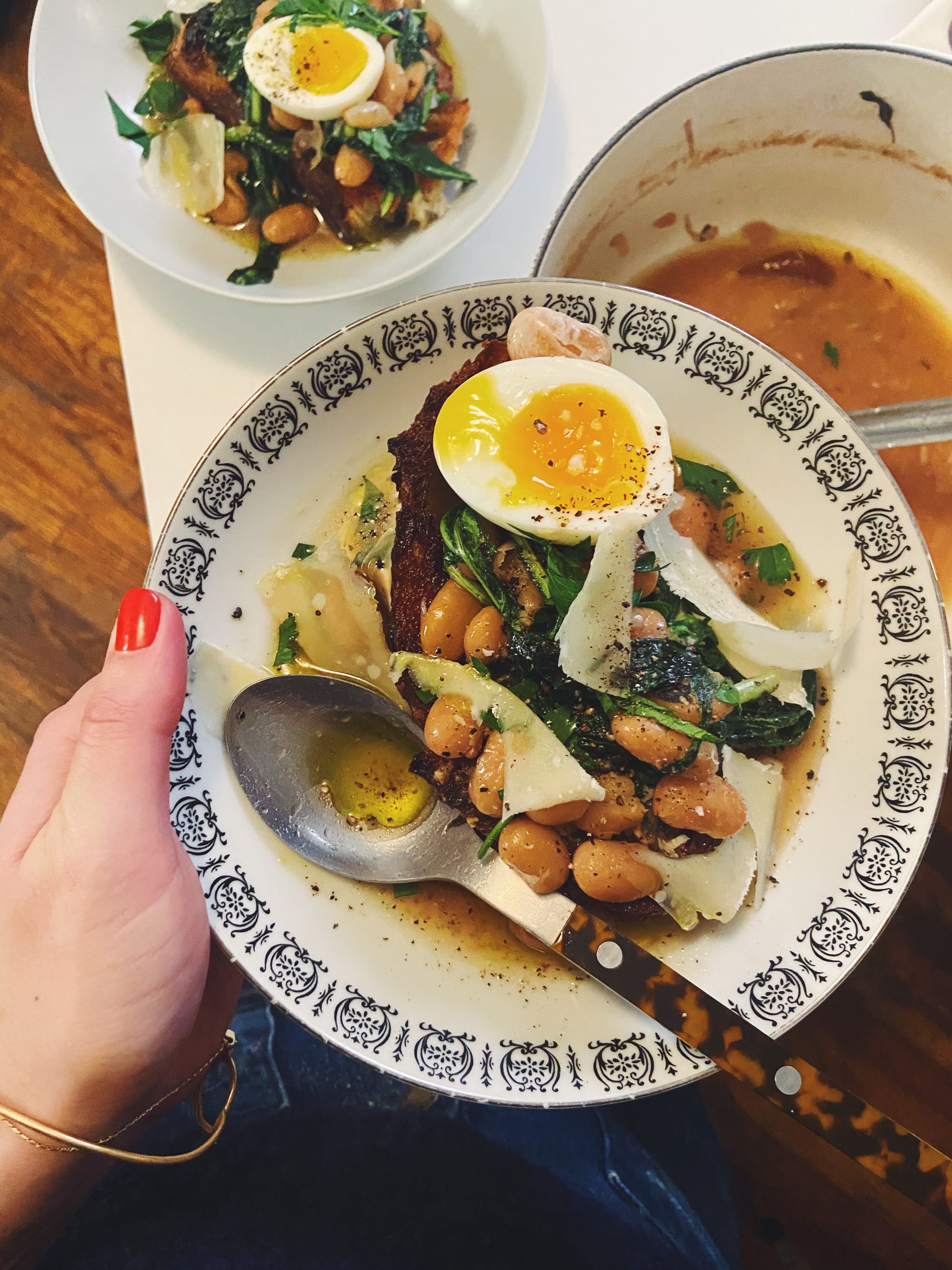 Wilt a handful of dark leafy greens (dandelion, kale, mustard, swiss chard, spinach, etc) in a glug of olive oil with some salt and pepper, ladle in some beans with their broth, swirl to incorporate. Serve the beans and their broth over thick-cut olive oil toast (crusty bread, fried in olive oil on the stovetop till crispy, 2–3 minutes per side). Eat with a six-minute egg (place eggs in a small pot of boiling water, boil for six minutes, remove from the water, and cool in an ice bath or cold running water) with some shaved or crumbled salty cheese (parmesan, pecorino, queso fresco, feta), coarsely chopped or torn fresh herbs (parsley, dill, cilantro) and more olive oil (beans really love olive oil, and so do I).