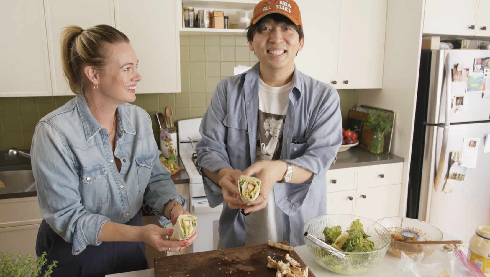 7. In a large bowl, toss lettuce with dressing until everything is well-coated and perfectly dressed, then chop the lettuce into bite-size pieces. Gently warm the tortilla or wrap vessel of your choosing over the stove for a few seconds on each side. Top with dressed lettuce, slices of chicken, a few more anchovies, grated cheese, and breadcrumbs, making sure you leave a border between the fillings and the edge of the tortilla so as not to overfill (rookie mistake!). Fold in two sides of the tortilla, then gently roll the wrap away from you (like a burrito), making sure everything stays tucked in as you go. Cut in half so you can show all your friends.