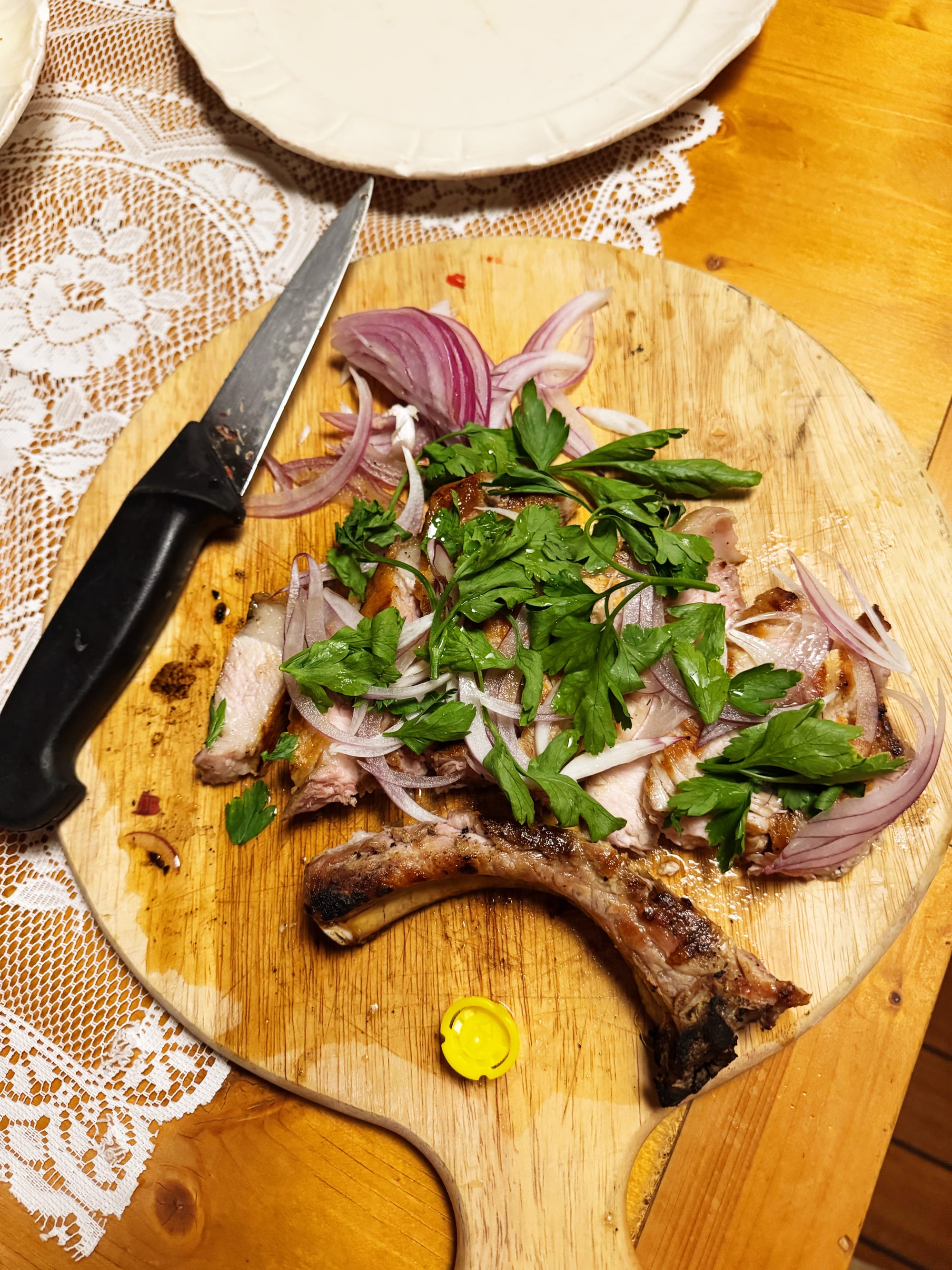 I seasoned a 2-inch thick pork chop with salt (there was no pepper in the house) and let it sit for an hour or two. I grilled it over high heat for about 4–6 minutes per side, flipping every 2 minutes or so to avoid clear grill marks. At the end, I like to give it a kiss on the grill fat cap side down. This gets you a pork chop that’s beautifully golden brown on the outside, delightfully medium-rare (pink-ish) on the inside. When it was still warm, I sliced it (with a “knife”), scattered thinly sliced red onion over top and finished it with lemon juice and parsley. The red onion softens from the warmth of the meat, the pork and lemon juices mingle, the parsley, well, it stays leafy, spriggy, coarse. It’s a nice way to serve nearly any simple grilled (or, if you wish to sear!) meat, I think.