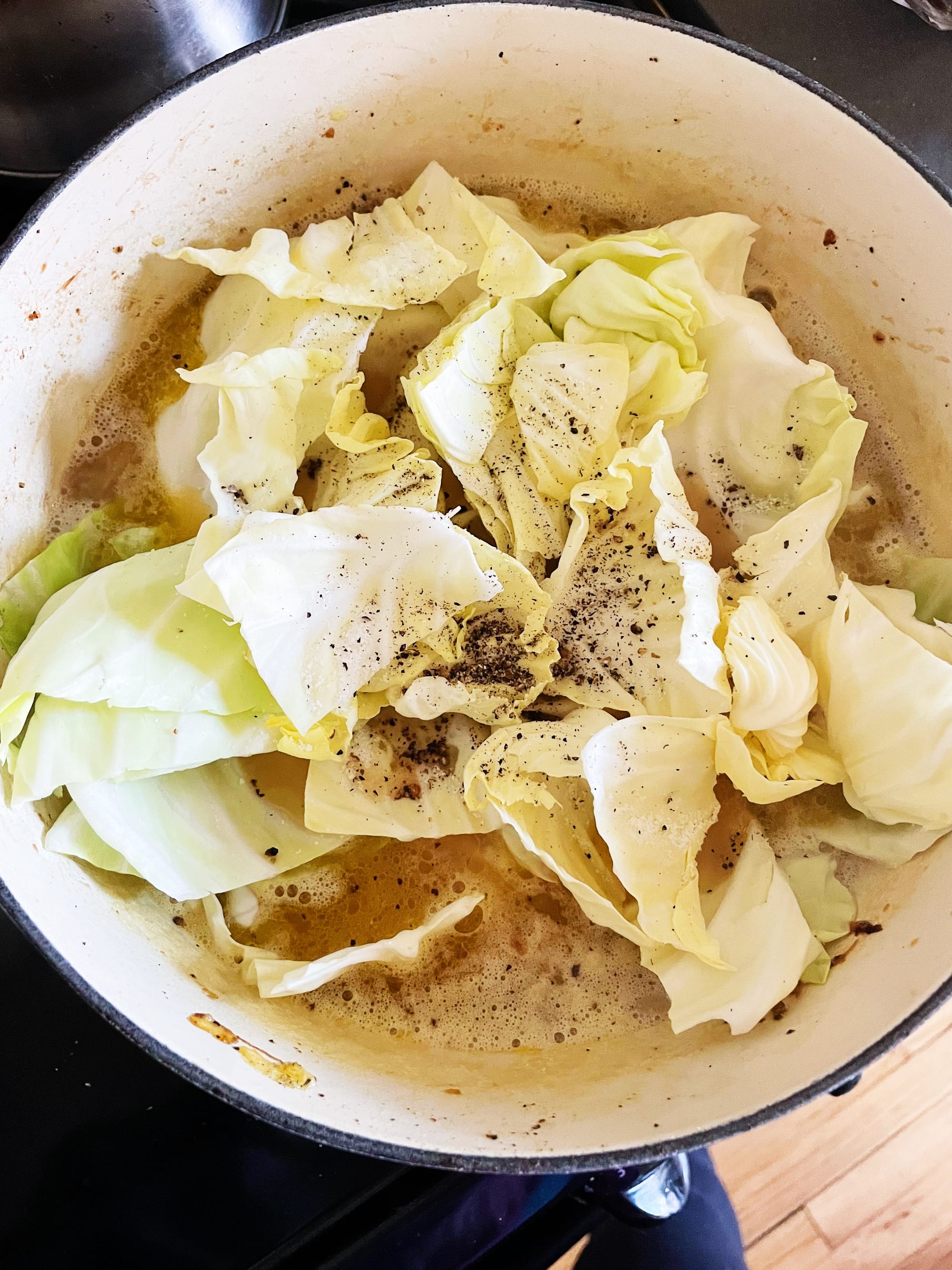4. Add the broth (or water + bouillon) and bring to a simmer. Simmer until the texture is to your liking (soupier, stewier, you choose) and everything is tasting nice and savory, 15–20 minutes or so. Add the cabbage and vinegar, stirring to wilt. Simmer until the cabbage is totally tender and all the flavors have melded, 10–15 minutes. Season with salt, pepper, and more vinegar if you like.