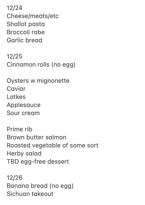 In case you were wondering how I’m personally handling Christmas and the first night of Hanukkah falling on the same night, here’s my menu plan for our house full of family over the week (we’ve got one pescatarian and one egg allergy). Stay tuned next week for my New Years Eve plan, which now somehow involves three types of ham (long story).
