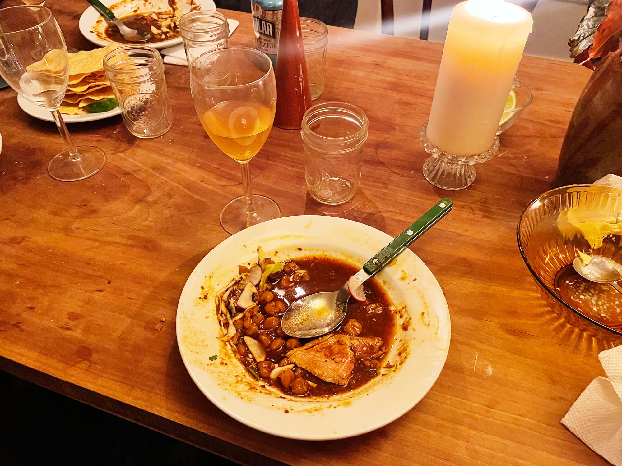 The next day I brought the pozole back from its timeout on the porch and slowly reheated it. I kept it warm on the stove with a ladle inside the pot, the universal symbol for “please serve yourself, I will not be serving you.” I served it next to plates full of shredded green cabbage, carelessly chopped cilantro, thinly sliced yellow onion and radish, lime wedges that really weren’t all that juicy because they were old (my fault) and more dried chiles. There was also a plate of tostadas, which I find better for this than tortilla chips for sturdiness and DIY crumbling, as well as a little finely chopped Serrano chili mixed with raw garlic, salt and white distilled vinegar, for seasoning almost like hot sauce. I sure do love to celebrate any food that requires an abundance of toppings.