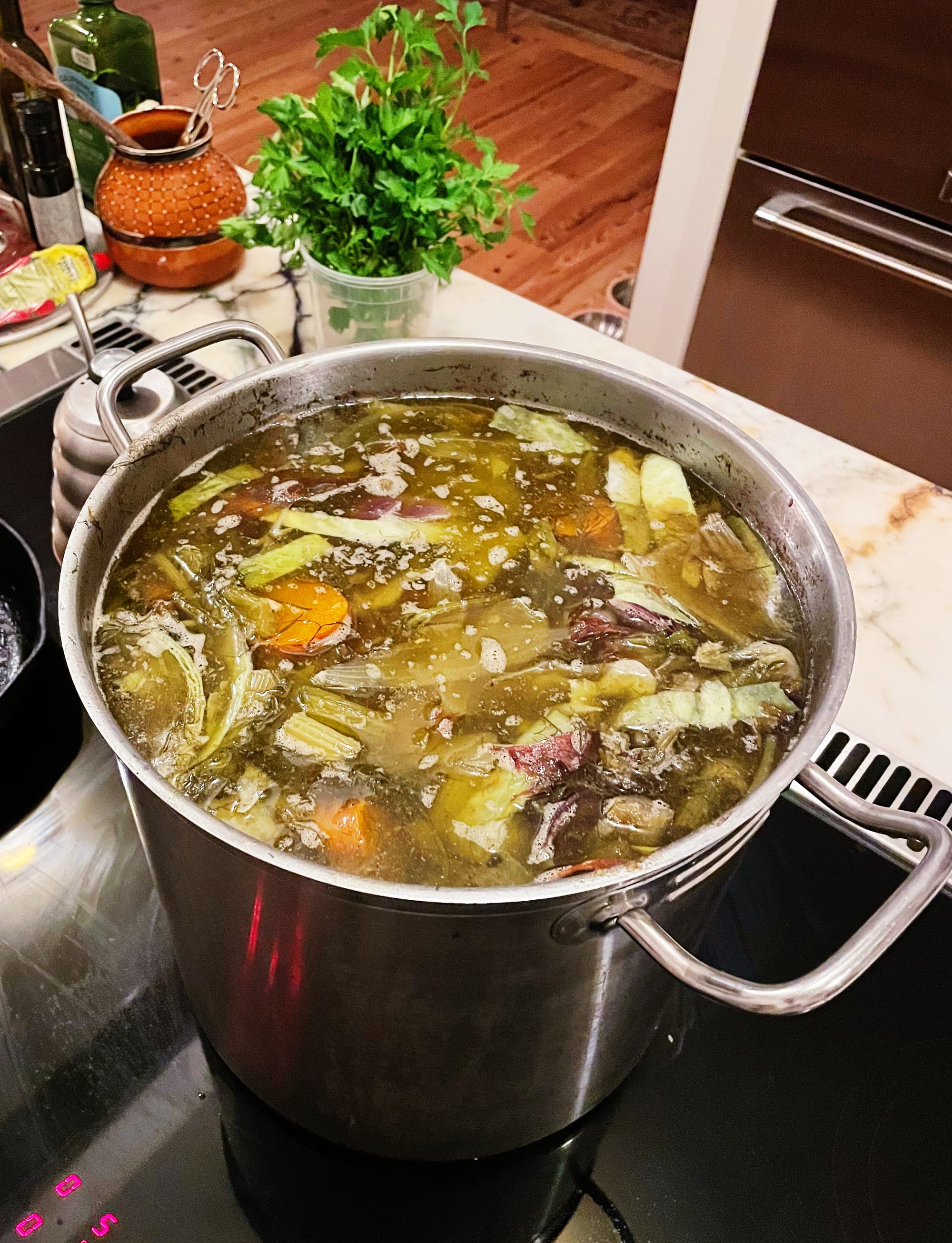 Soup three was just frozen chicken broth I had made, probably from the carcass of a roasted chicken. I do this every time I roast a chicken, not dissimilar to ham bone broth, and thus my freezer is never without at least one or two quarts of homemade chicken broth. To do this, take the carcass of your last roasted bird and place it in a medium pot with a chopped onion, skin and all, some vegetables (including but not limited to: celery, carrots, parsnip, fennel, turnip), a good amount of salt, and whatever was inside the cavity of that bird. Simmer this on medium until you need to go to bed, then strain it into whatever reusable glass or plastic containers you prefer, then freeze and forget about it until one day you wake up and absolutely need some nice homemade broth. You can also make it intentionally from uncooked chicken (matzo balls optional, of course).