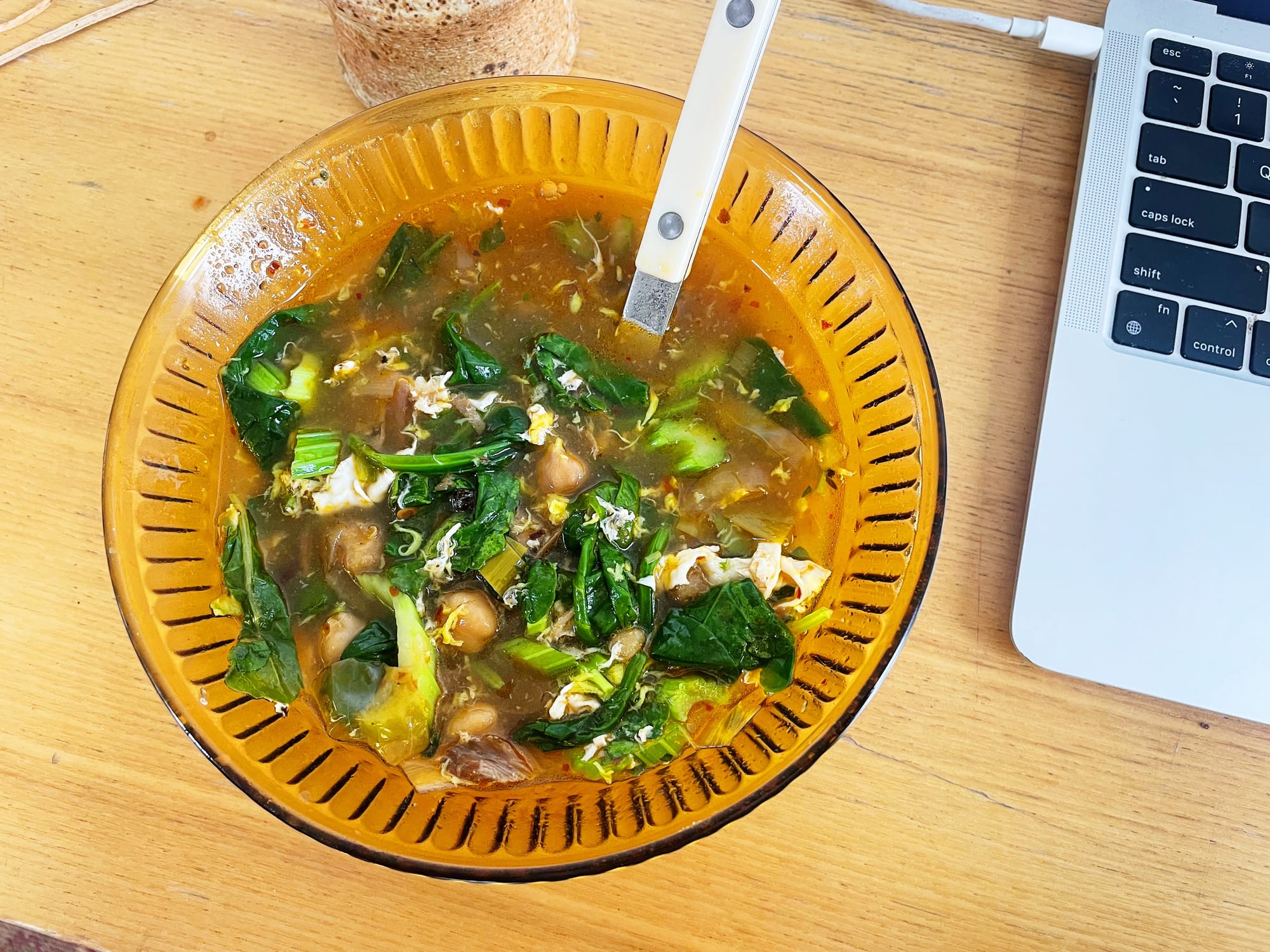 So soup four, that Ephemeral Soup. Imagine blending the pork and hominy studded chili broth with some long cooked chickpeas and thinned out with some defrosted long-ago made chicken broth. Already delicious, but in the name of trying to be more mindful of the produce I throw away, I added the last of the shredded cabbage, torn bodega kale and a half a stalk of limp celery (thinly sliced) to soften in the soup before cracking an egg to swirl around and cook in the broth. I finished it with more olive oil, crushed red pepper flakes and the sad juice of a little old lemon nub.