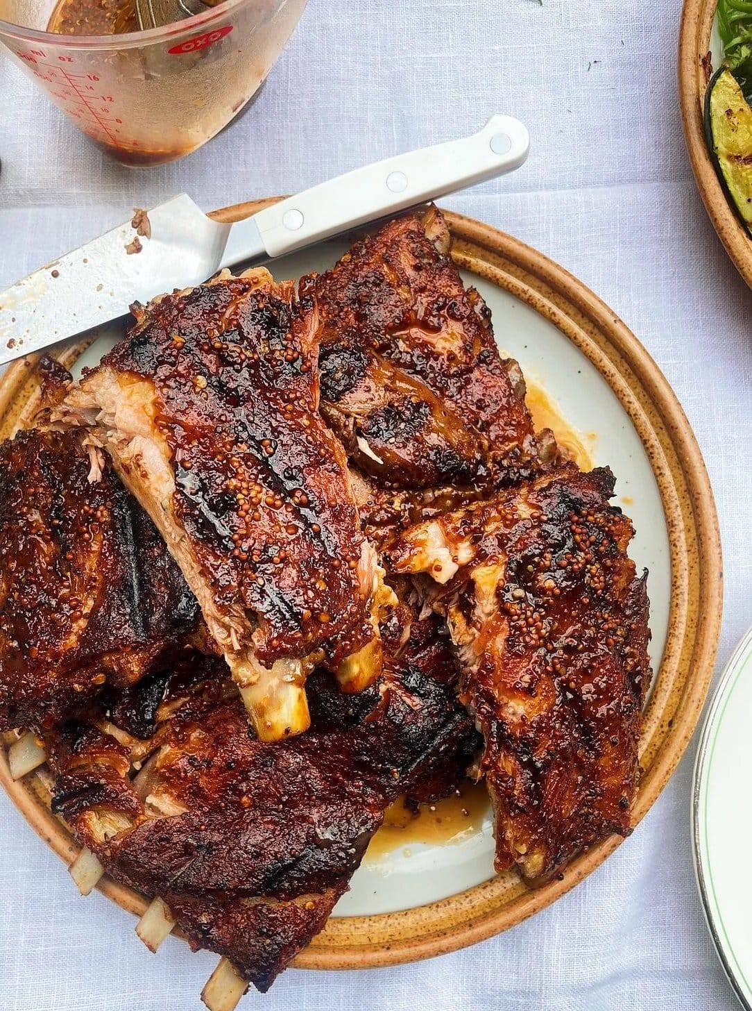 Gorgeous Spicy Grilled Ribs. These ribs start like all wonderful ribs: rubbed with spices, slowly cooked (these are done in the oven because a “pit master” I am not), then finished on the grill, basted with a highly vinegar’d sauce with lots of mustard. While they are good right from the oven (pulled-pork, really), the grill makes them special and smokey and charred and wonderful. Here’s the video for them (which includes a bonus recipe for grilled zucchini, also doused in vinegar).