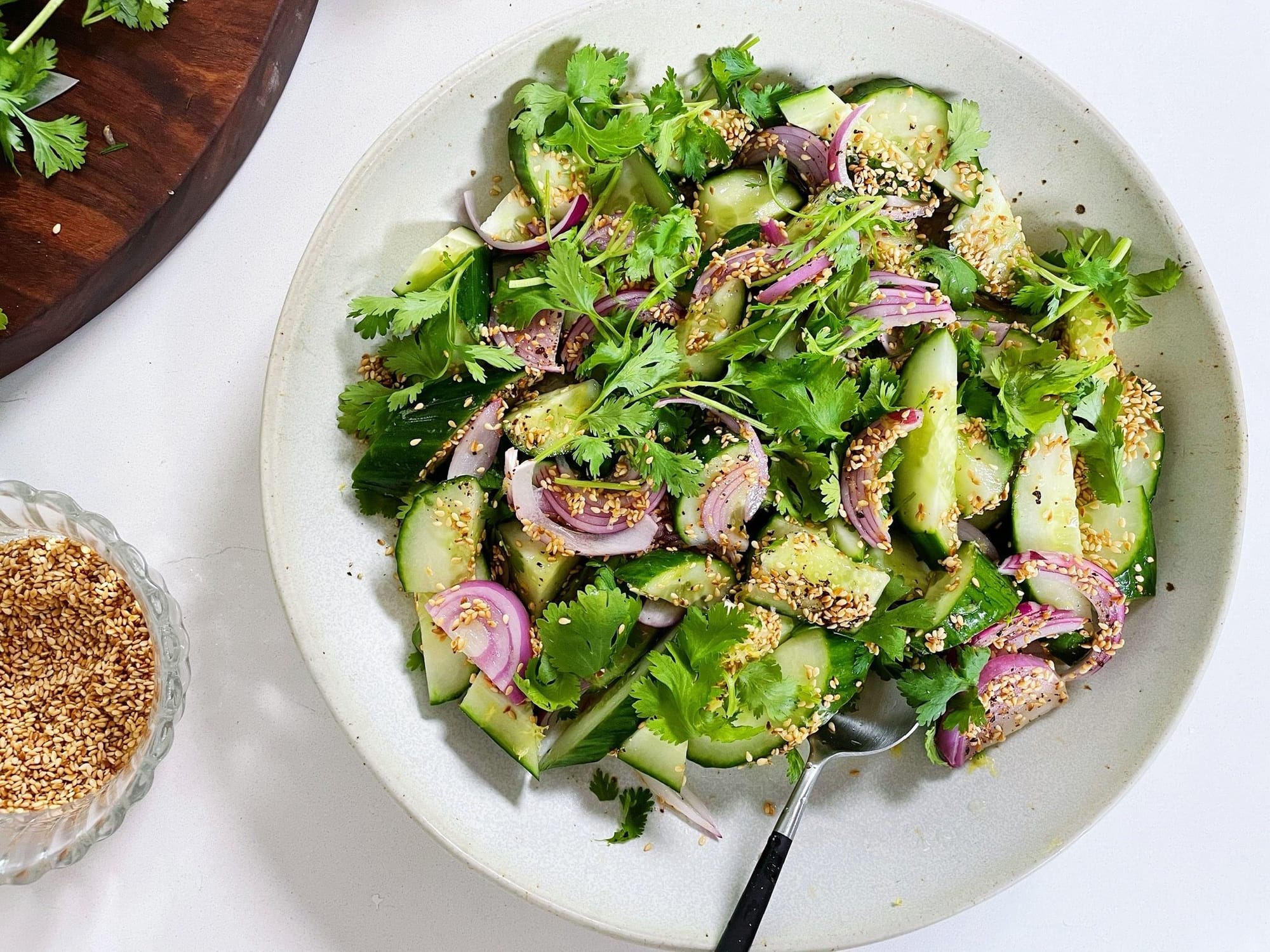Cucumbers with Red Onion and Sesame. I got some nice cucumbers from Lani’s Farm this Sunday and they are BEGGING me to turn them into this. Sour and oniony, toasty and sesame-y. God, these are good (don’t even need the hot dog).