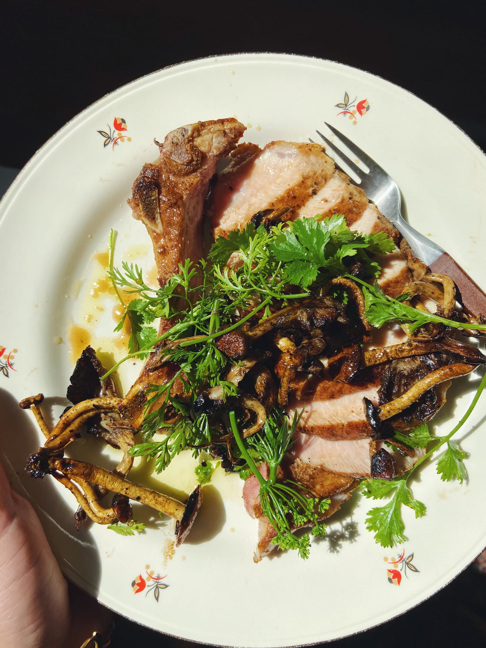 Let’s make it pork chops. Ditch the brothy vibe, keep the peas. Sounds good. “We picked and ate all the peas last night,” my friend said. Okay, pivot again. We found beautiful chestnut mushrooms from Moorit Hill that look like teeny chanterelles but taste like shiitake. Okay, but that’s feeling wintry. Pivot. Let’s cook the mushrooms in the pork fat rendered from the chops, add vinegar and herbs and make the whole thing more salad-y. That’s right, another salad. Love it. ABP. Always Be Pivoting.