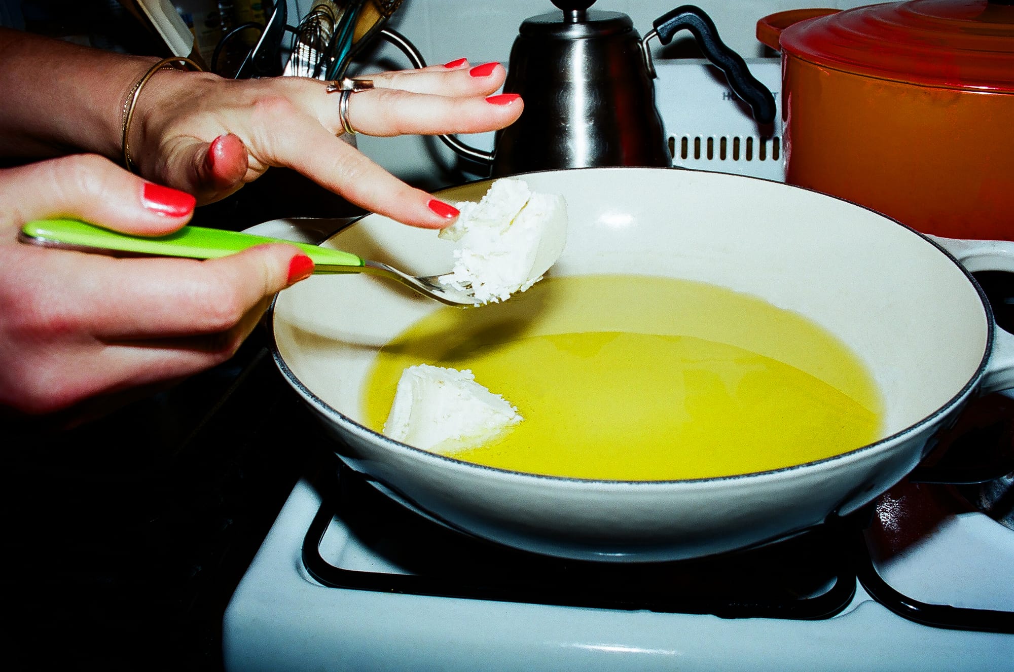 1. Heat butter and olive oil in a large skillet or wide, shallow pot. If the butter is in a container and you’re using a spoon, be sure to lick your finger afterward because butter tastes very good, even all on its own.