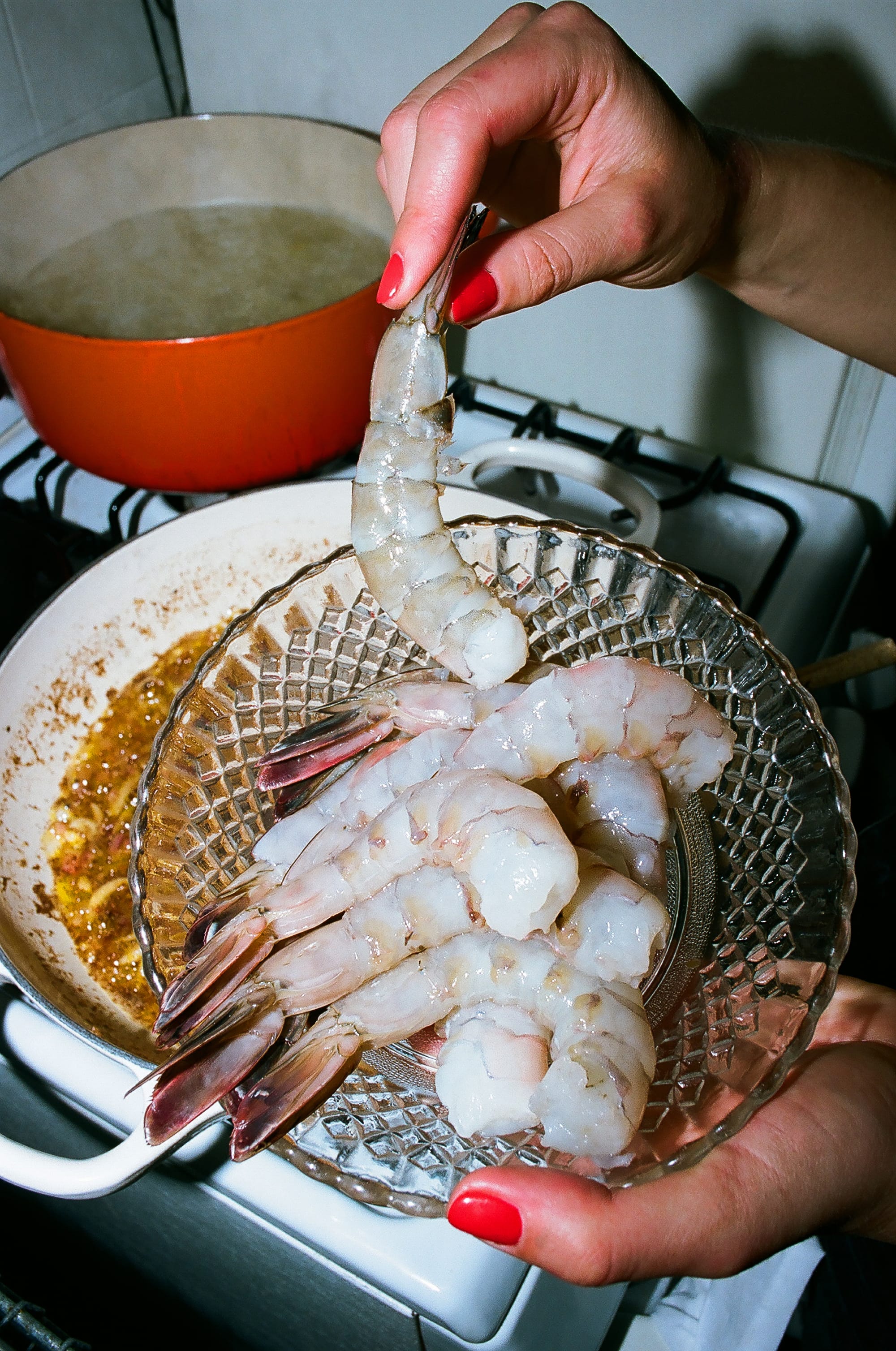 4. Introduce the shells to the shrimp, cross your fingers that everyone gets along. Add herbs, squeeze of lemon, maybe something spicy. Don’t rush things, let them all get to know each other first. Make yourself a bowl.