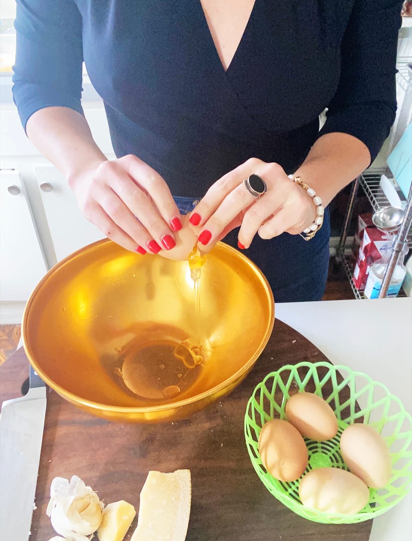 5. Whisk in ¾ cup pasta water to the egg/cheese mixture and then add pasta to that bowl, using your tongs to toss, toss, toss.