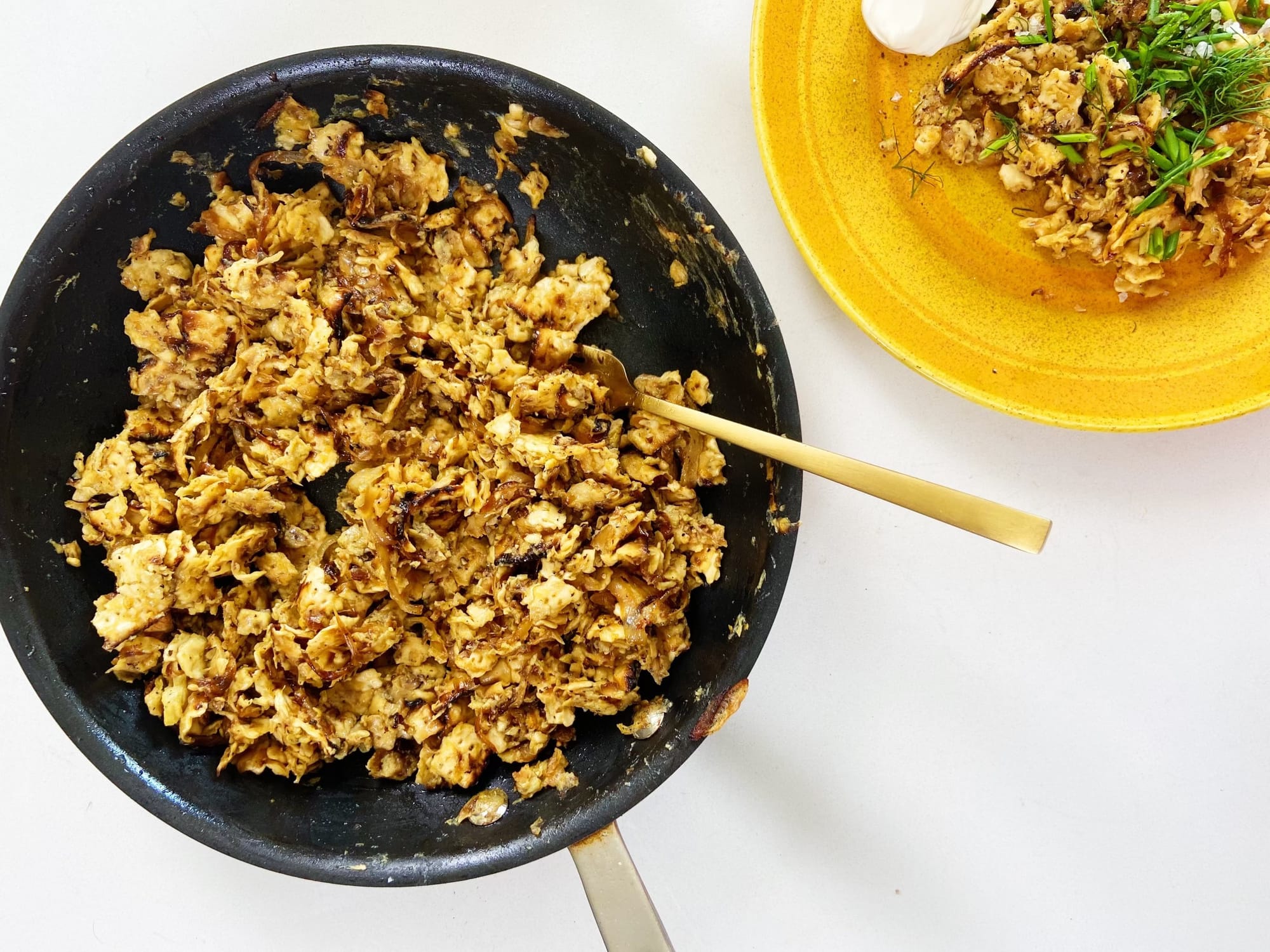 I didn’t know the “other” (sweet, pancake) version of matzo brei existed till about 2013 and I haven’t thought about it since. This one (savory, scramble) is made of fried onions with just enough egg to bind them to the delicately soaked matzo and scrambled until just set. It’s got a lot of butter and I like to eat mine with sour cream (full-fat Greek yogurt is fine, sour cream is better), but feel free to dress it like a latke, which means it’s also great with things like applesauce, lox or salmon roe.