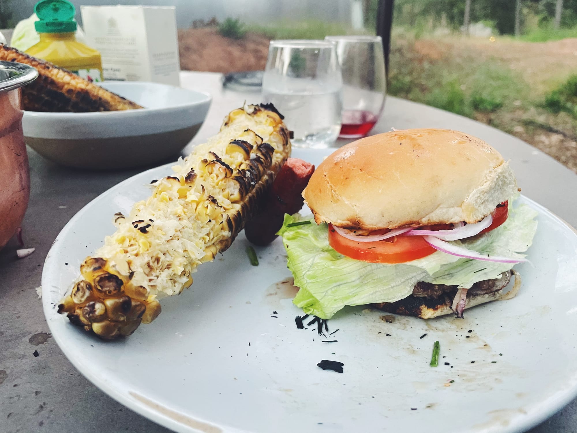 DAY THREE: cheeseburgers, cucumber salad, grilled corn and one hot dog dipped in mustard. We couldn’t find American cheese and there weren’t Martin’s potato rolls so I suffered a minor meltdown but cheered myself up by buying a package of hotdogs. Why does anyone bother making a burger bun that isn’t a Martin’s Potato Roll? I’ll never know. Cheddar cheese on a hamburger, I’d rather not! Anyway, these were Smashburger style (thin patty, grilled and raw onions, iceberg lettuce) and the only condiments purchased were yellow mustard and pickles, the only two condiments you need. They were, of course, seasoned with Maldon. I grilled-then-burned some corn and two hot dogs and made a very good cucumber salad with the rest of that cilantro and red onion.