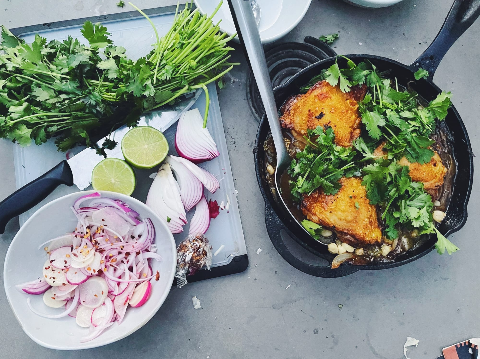 NIGHT TWO: chicken thighs swimming in tomatillo with tortillas, onions, and radish. I had big dreams that I would make posole over a bubbling cauldron but it was about 94 degrees where we were and couldn’t find a cauldron. Pivoting, I ended up just searing chicken thighs till crisped on one side, transferred them to a plate and cooked some quartered tomatillos, and sliced onion in the leftover chicken fat. As I mentioned, we didn’t bring enough water and I wasn’t sure what the potable situation was so I emptied a half bottle of San Pellegrino to make the tomatillos saucier. Much like seasoning everything with Maldon, I can’t say I recommend doing this, but it is what it is. I returned the chicken back to the skillet, added some raw garlic, let everything hang out together for a little where the fire wasn’t so hot. Sliced some onion and radish, covered with lime juice, added the leftover crushed red pepper flakes, and seasoned with Maldon lol. I bought one bunch of cilantro, the only herb I allowed myself to purchase, and so I really made it count here by adding most of one bunch. Stuck with wine and fell asleep at 9:15.