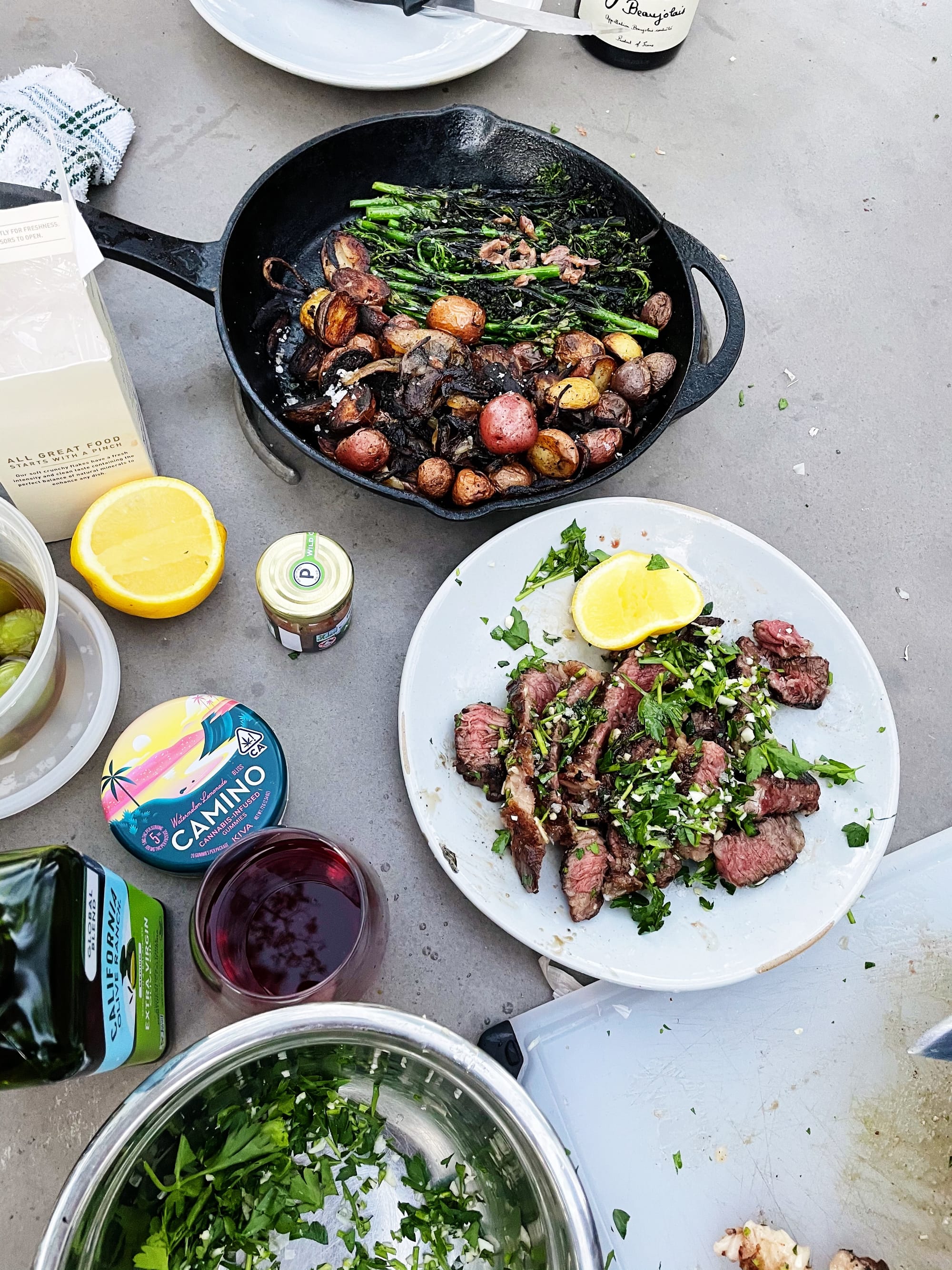As the potatoes finished cooking, I grilled the steak on the grates until very browned on both sides, continuously flipping to avoid flareups, about 5 minutes total (the flame was hot and the steak wasn’t as thick as I’d like). Once that was done, I moved it to a plate and scattered it with finely chopped parsley/finely chopped raw garlic while it rested. I salted it a second time because I didn’t trust it was salted enough to start, and as a result, the steak was way too salty and for that: I am sorry. Do not –and I can’t stress this enough– season your food with Maldon. We ate everything with more of the parsley/garlic mixture, a squeeze of lemon on the broccolini, and a 1/4 of a gummy that was still too strong for someone with an extremely low tolerance for anything containing THC. I ate 84 Tate’s cookies for dessert.